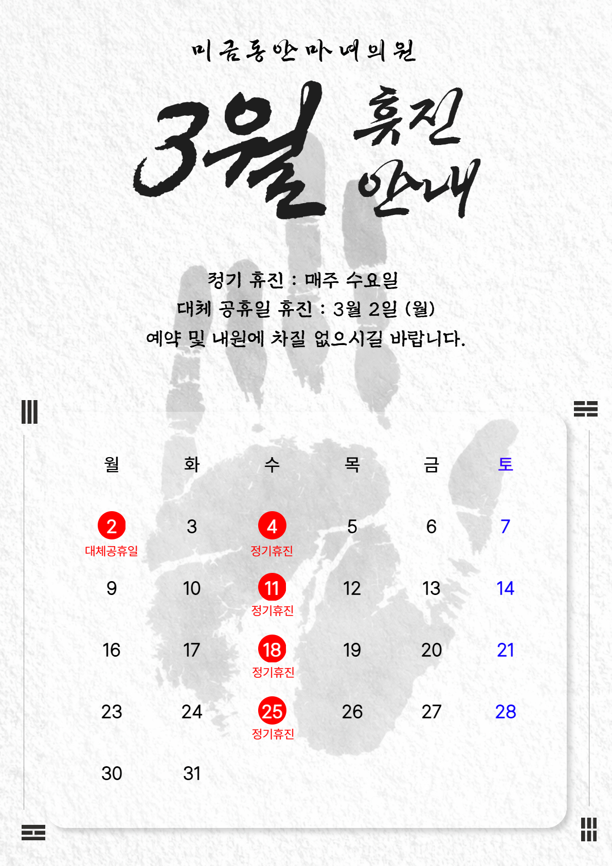 ✅대체 공휴일 휴진 : 3월 2일 월요일